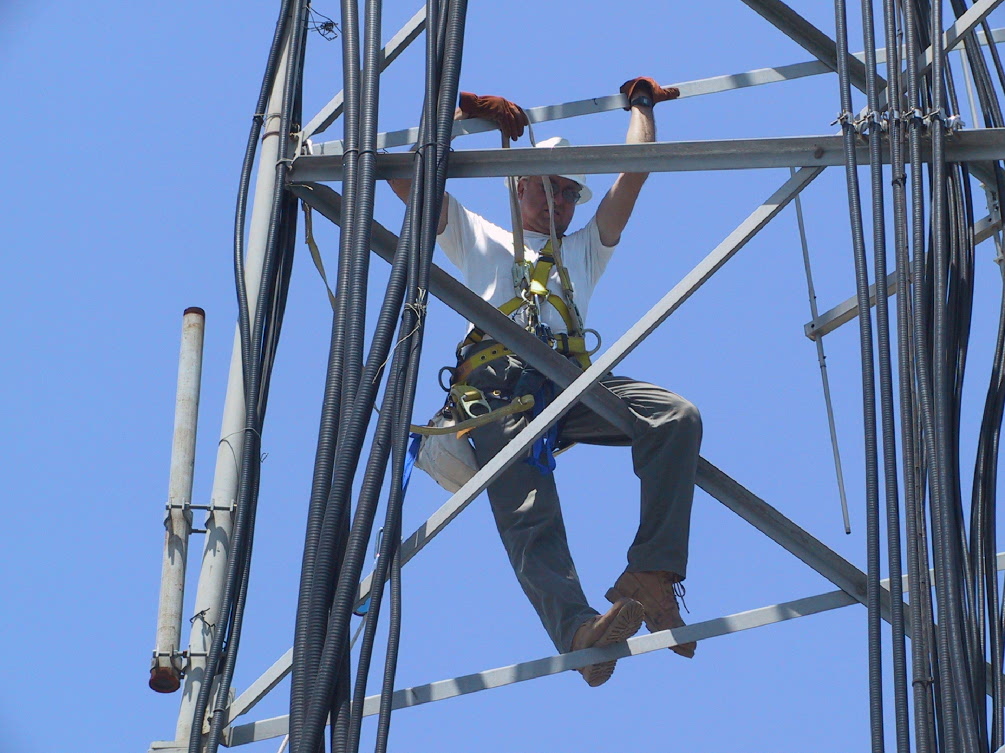 This station shares space with many others on a fine site in northeast San Antonio. In addition to providing a UHF blanket for the city and Bexar County, the radio links to Choate and thence to Odem south, to Blanco and to Austin and Kerrville to the north and to San Antonio West and ultimately, California to the west. Freestanding towers are tough to climb. Special hardware is needed for antenna mounts.